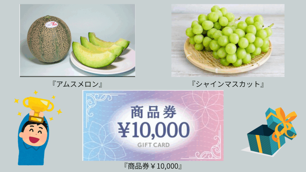 特典は毎回豪華で、1万円の商品券や季節のフルーツ・ギフトセットなどがもらえます。