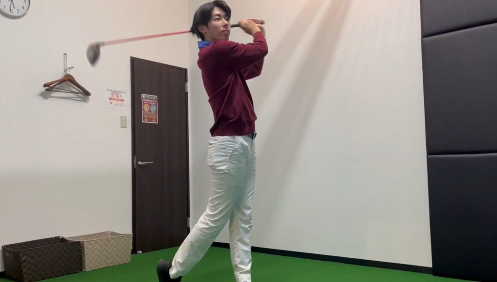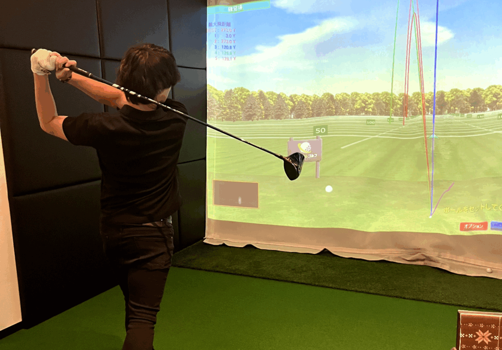 インドアゴルフ施設でドライバーの素振り練習を行う女性